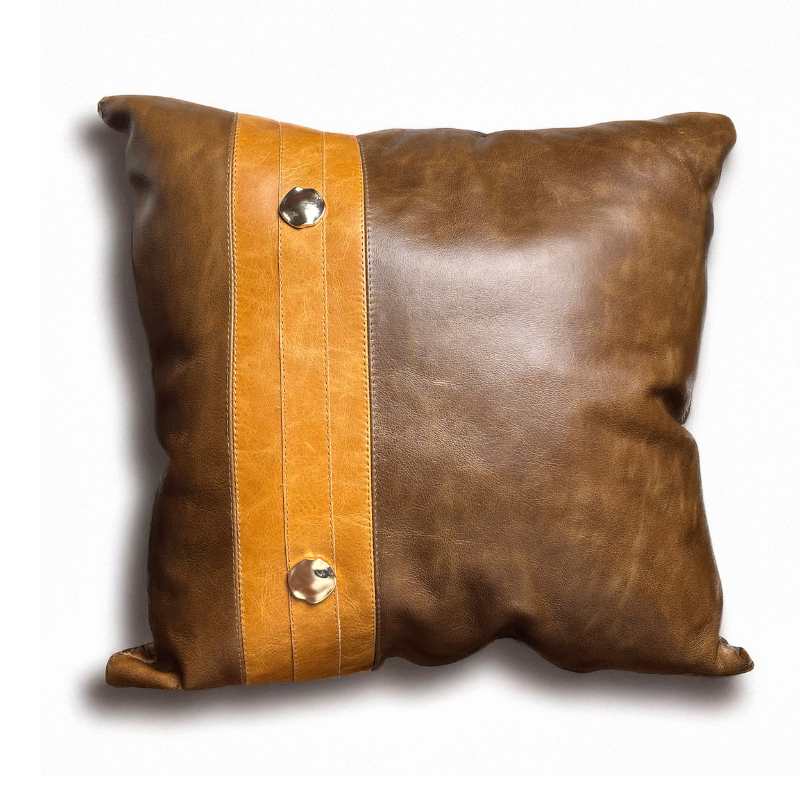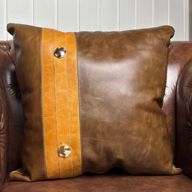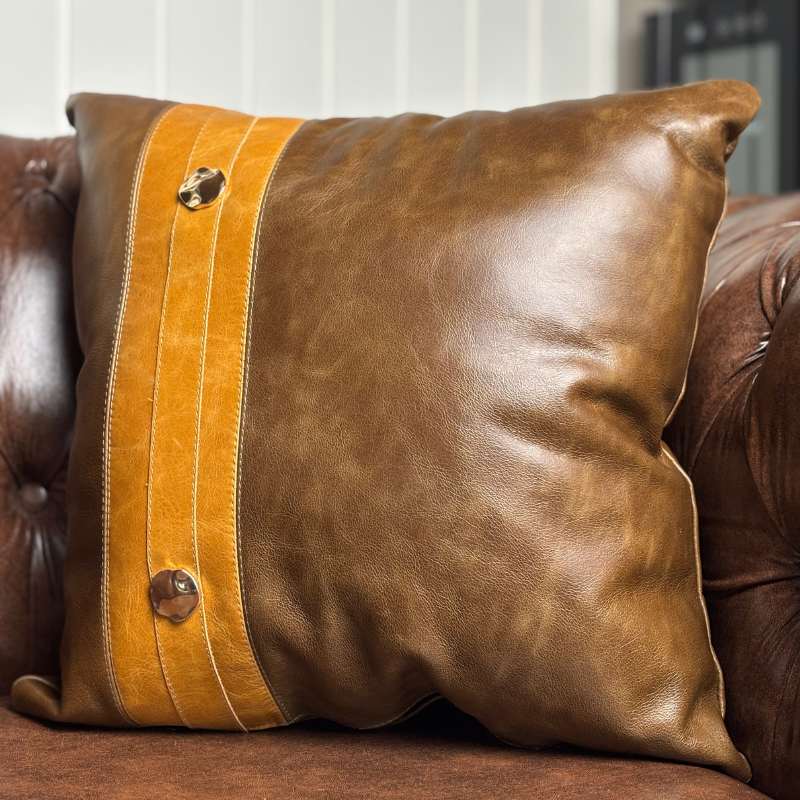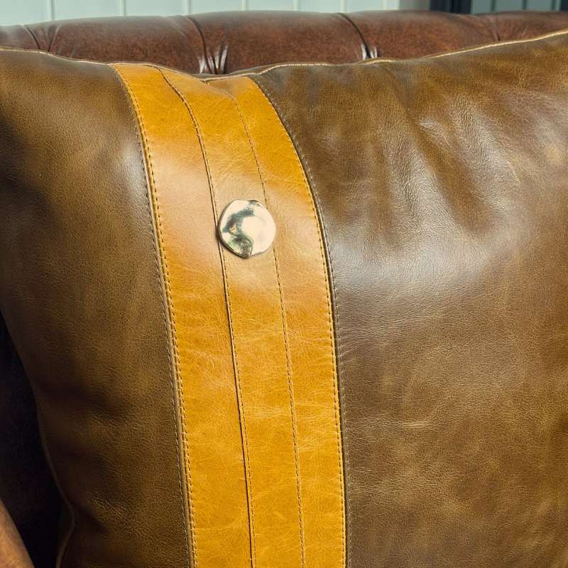 Confeccionada em couro legítimo marrom, a almofada Solara se destaca pela faixa vertical em couro amarela, que adiciona calor e sofisticação ao ambiente. Os botões dourados aplicados manualmente completam o design com um toque artesanal e elegante.