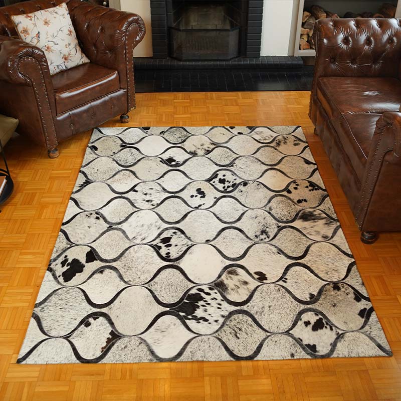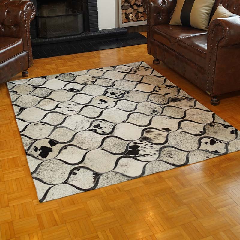 Cada tapete é único, refletindo a autenticidade do couro natural e o cuidado manual de sua confecção.